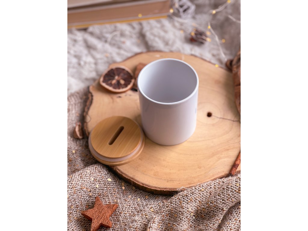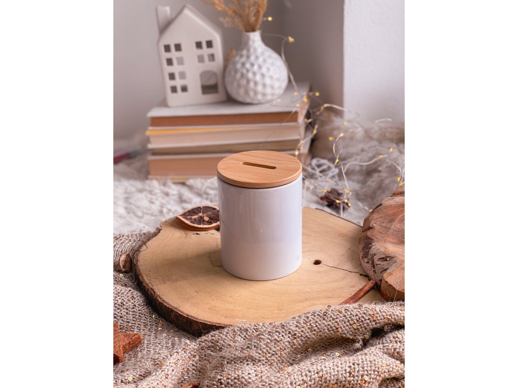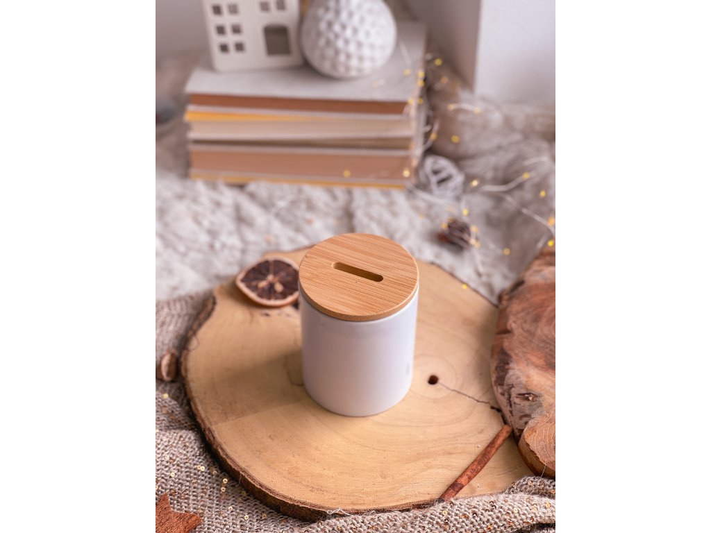 Bílé keramické tělo působí čistě a nadčasově. Bambusové otevírací víčko dodává jemný přírodní kontrast – a hlavně praktičnost. Kasičku nemusíš nikdy rozbíjet. Může s tebou růst roky.